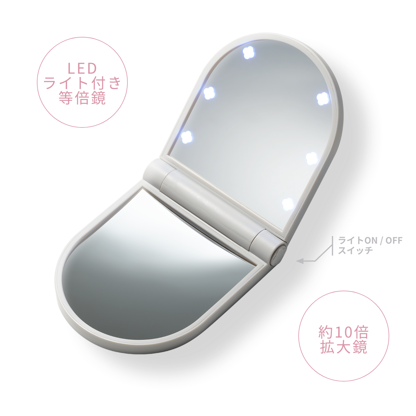 "The standard mirror features LED lights in the shape of KOBAKO’s iconic flower logo, allowing you to check your makeup clearly even in low light or at night.
