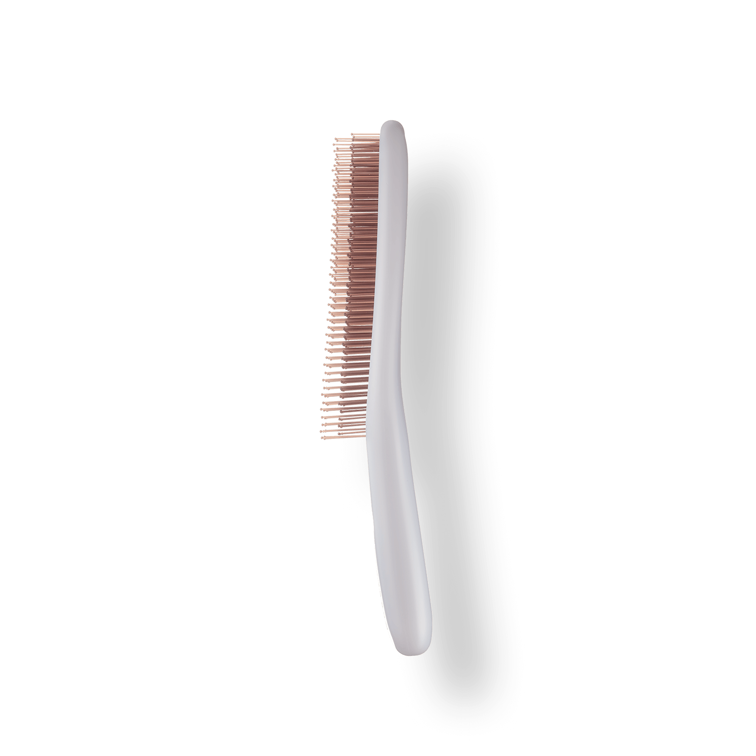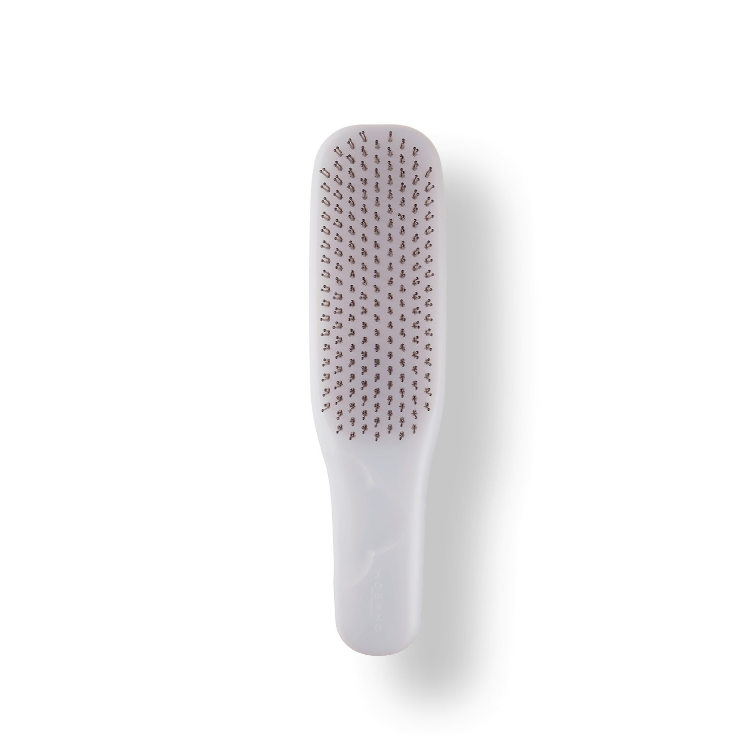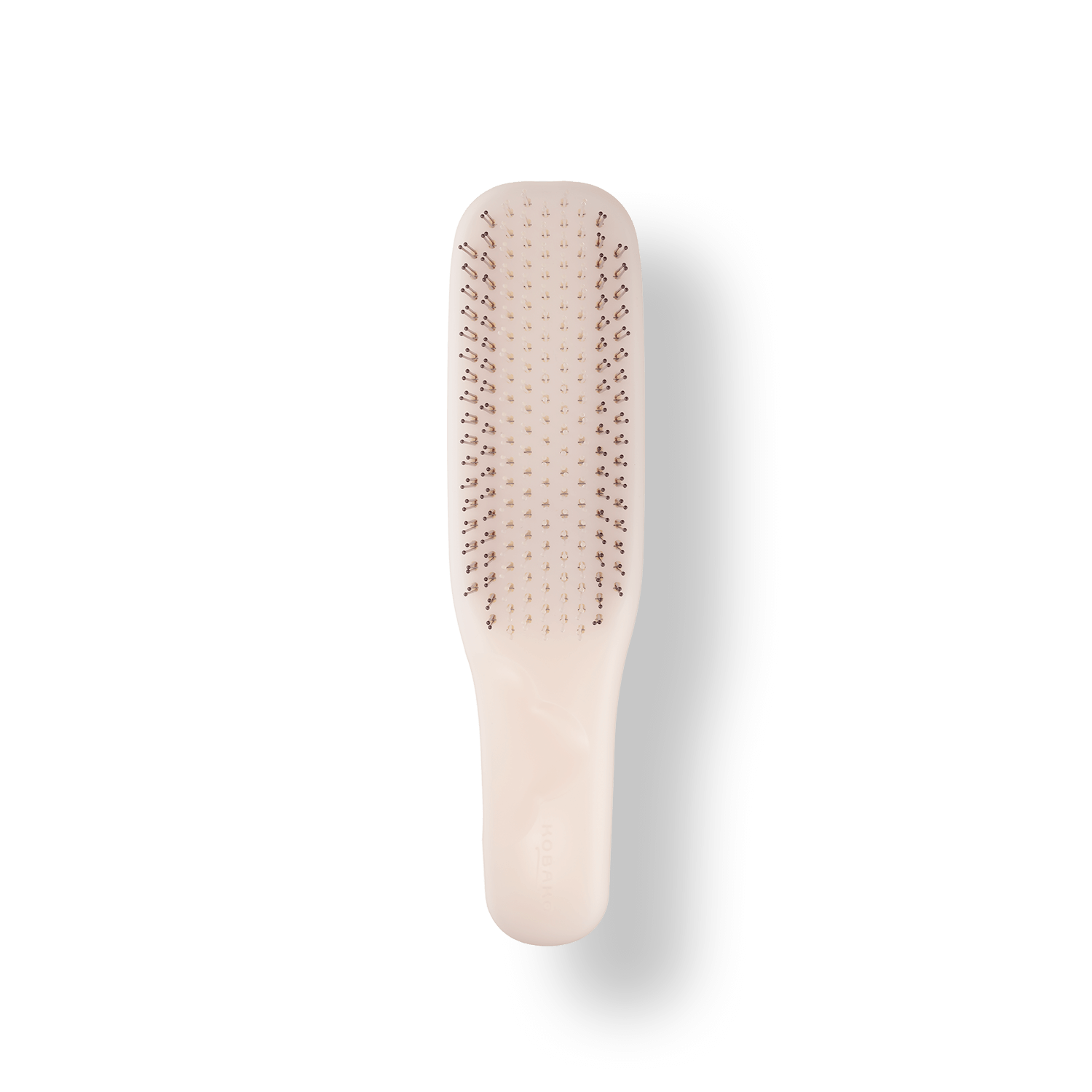 This brush features soft, transparent pins on the inner rows and firm brown pins on the outer rows. The longer pins gently glide over the scalp, providing smooth and flexible brushing.