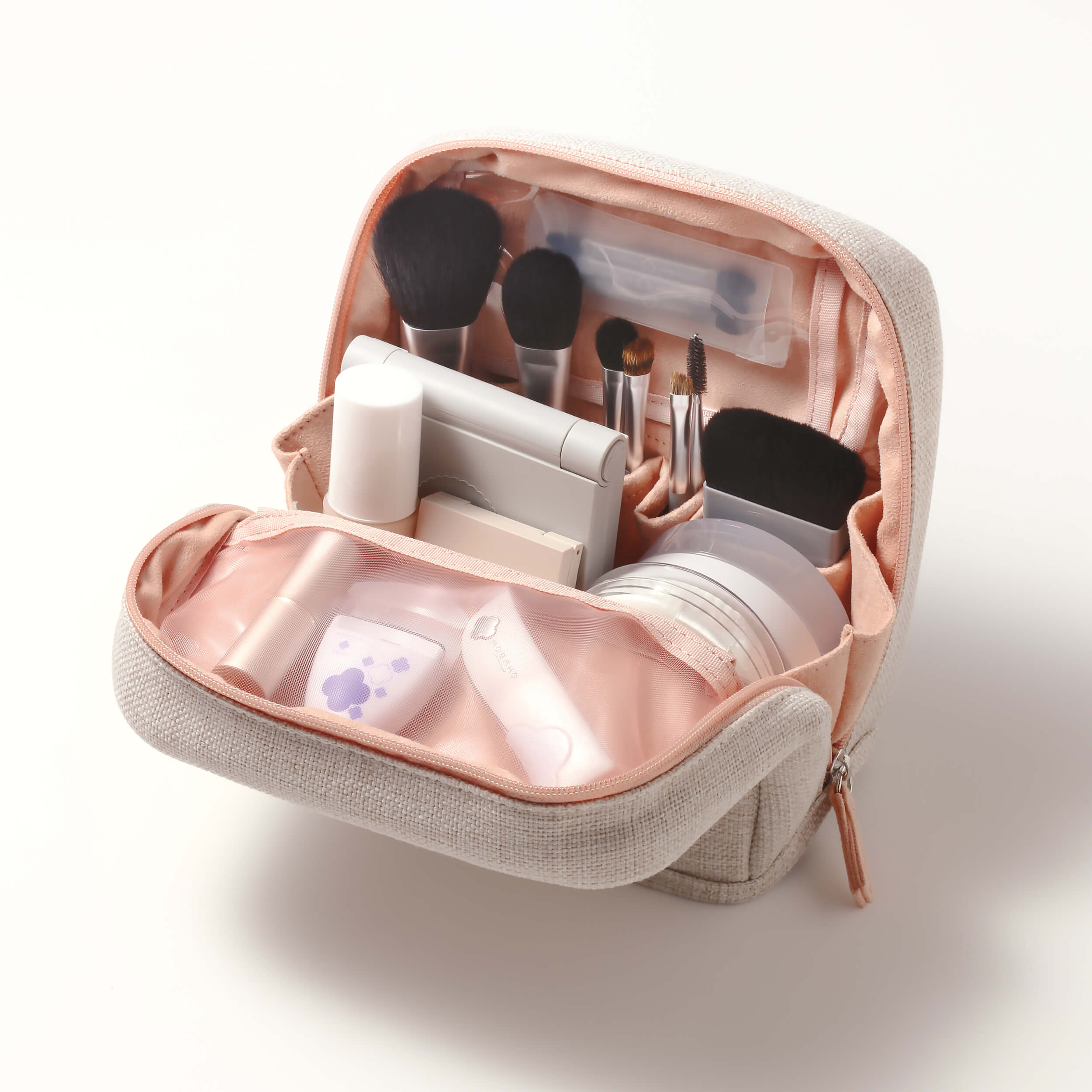 The pouch features an elegant natural beige exterior and a cheerful salmon pink interior.